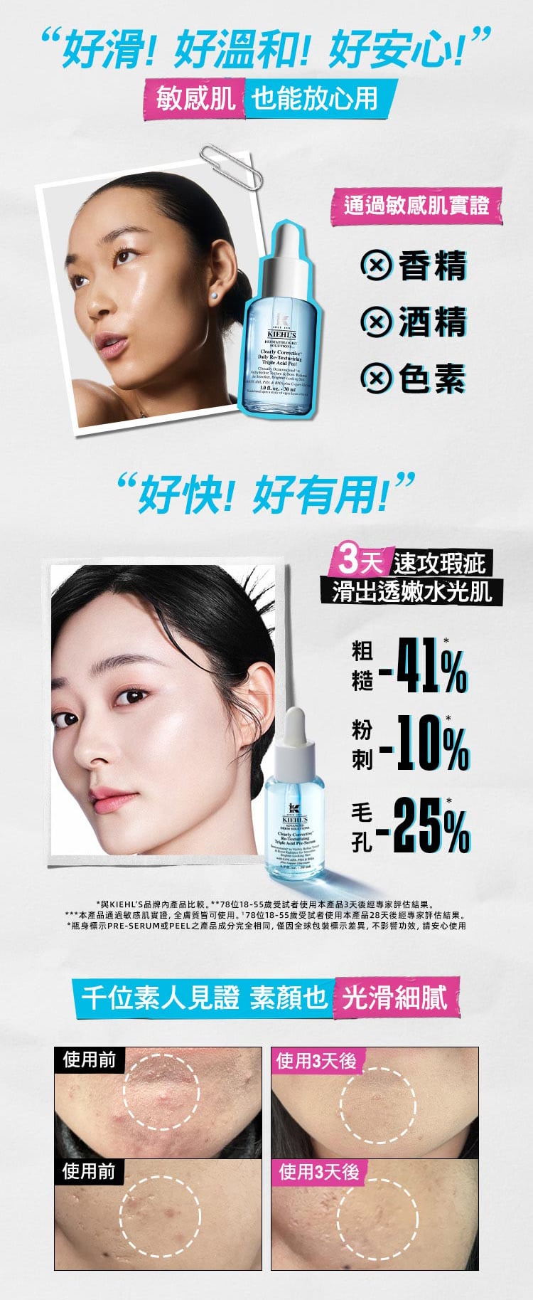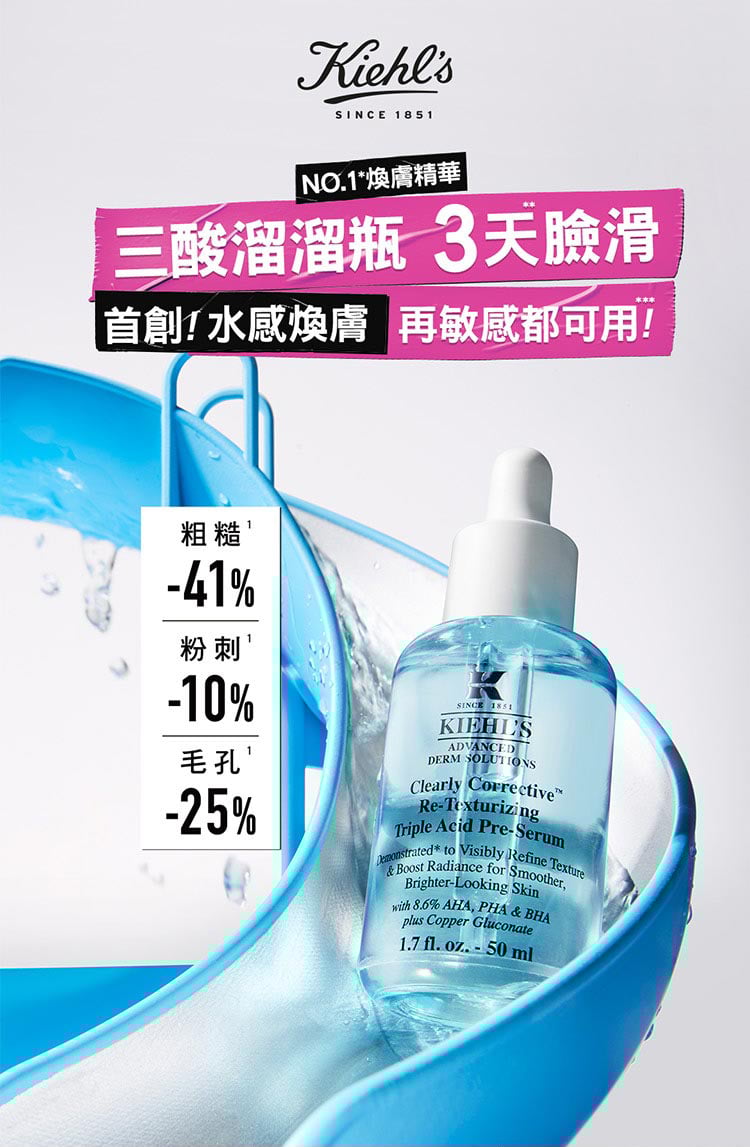 *與Kiehl’s品牌內產品比較。**78位18-55歲受試者使用本產品3天後經專家評估結果。